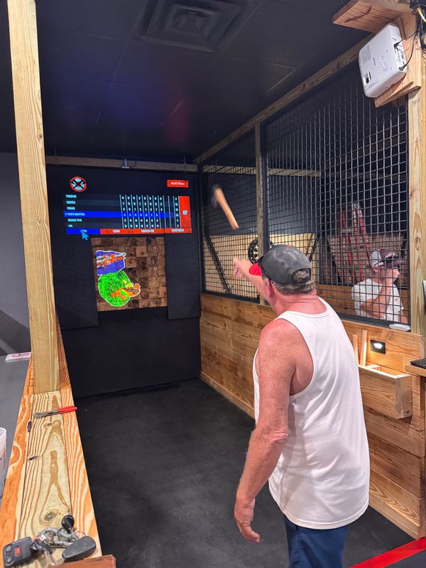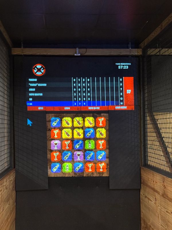 I know what you're thinking... do you throw real axes? Yes, you throw real axes at a real target. The simulation is projected onto the target, and the score is kept automatically in real time. You get to choose from the 18 games we offer. With 4 bays holding up to 6 players per bay, this is axe-throwing fun for the entire family.